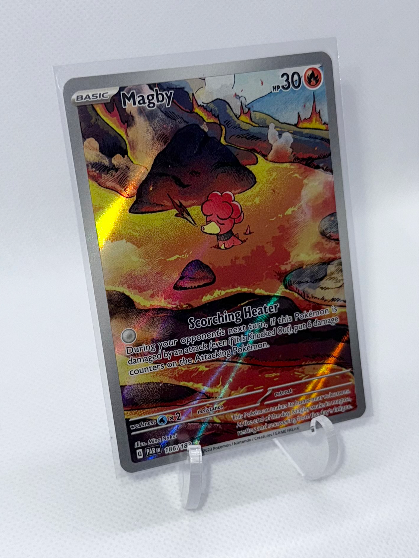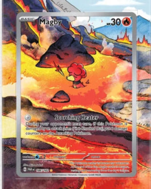 The Magby card, numbered 186/182, is an Illustration Rare from the Pokémon Scarlet & Violet—Paradox Rift set. This card features Magby in a vibrant, full-art illustration, capturing its playful and fiery nature.