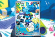 The Riolu card, numbered 215/198, is an Illustration Rare from the Pokémon Scarlet & Violet Base Set. This card features Riolu engaging in playful training activities, surrounded by various exercise equipment, capturing its energetic and determined nature.