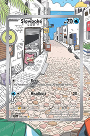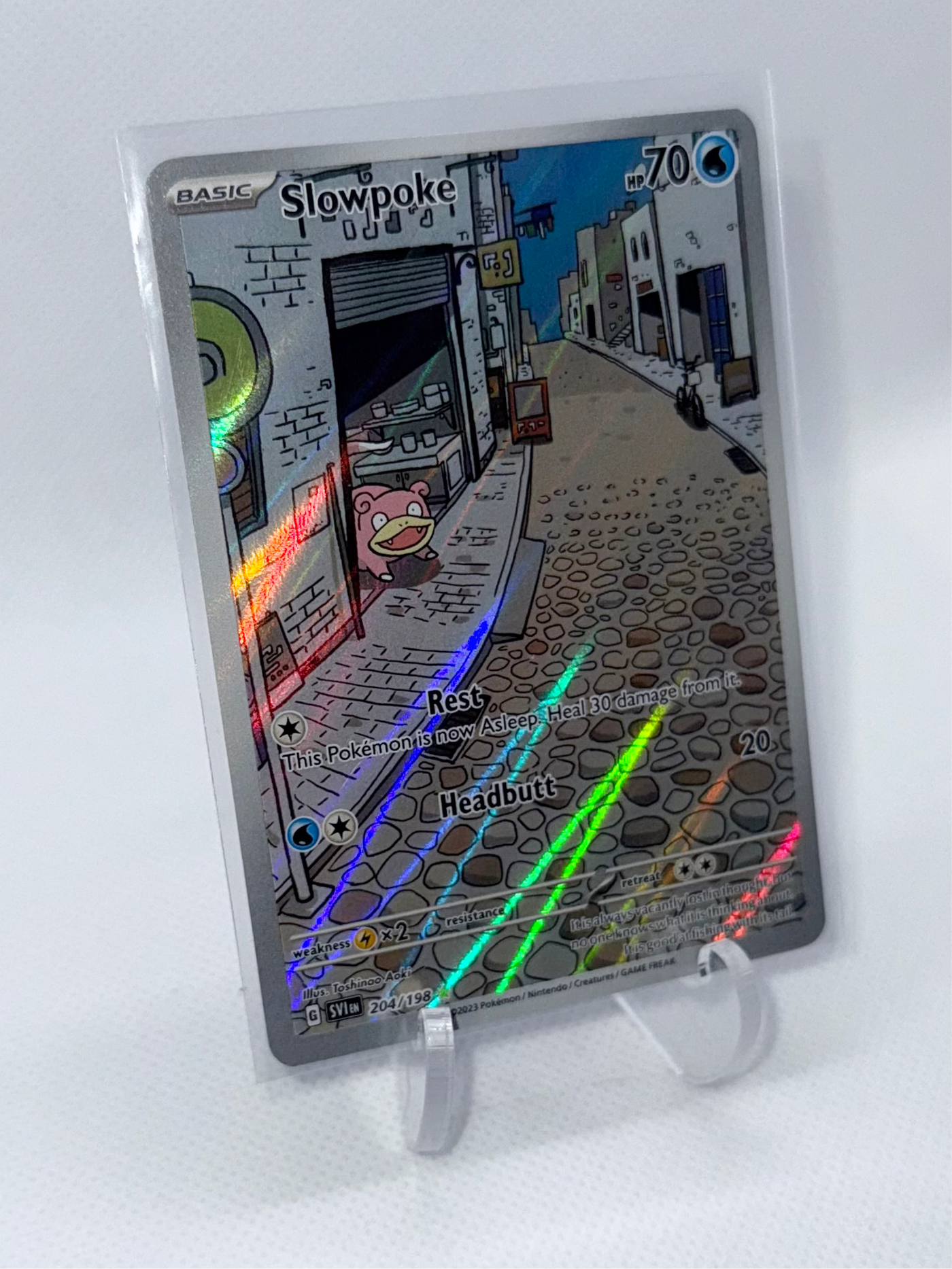 The Slowpoke card, numbered 204/198, is an Illustration Rare from the Pokémon Scarlet & Violet Base Set. This card features Slowpoke lounging in an urban alleyway, capturing its laid-back and carefree nature.