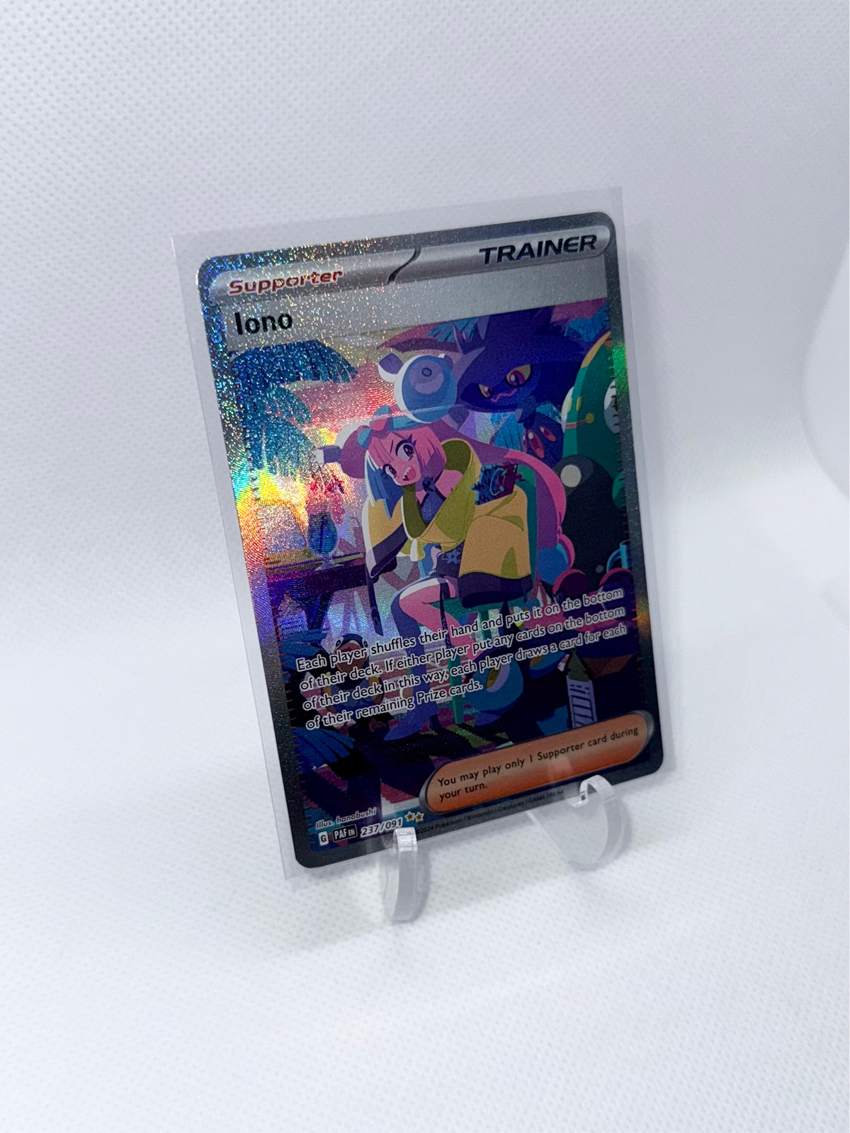 Introducing the Iono card from the Scarlet & Violet: Paldean Fates expansion! This Special Illustration Rare card, numbered 237/091, features vibrant artwork of the Electric-type Gym Leader, Iono, making it a prized addition for collectors and players alike.