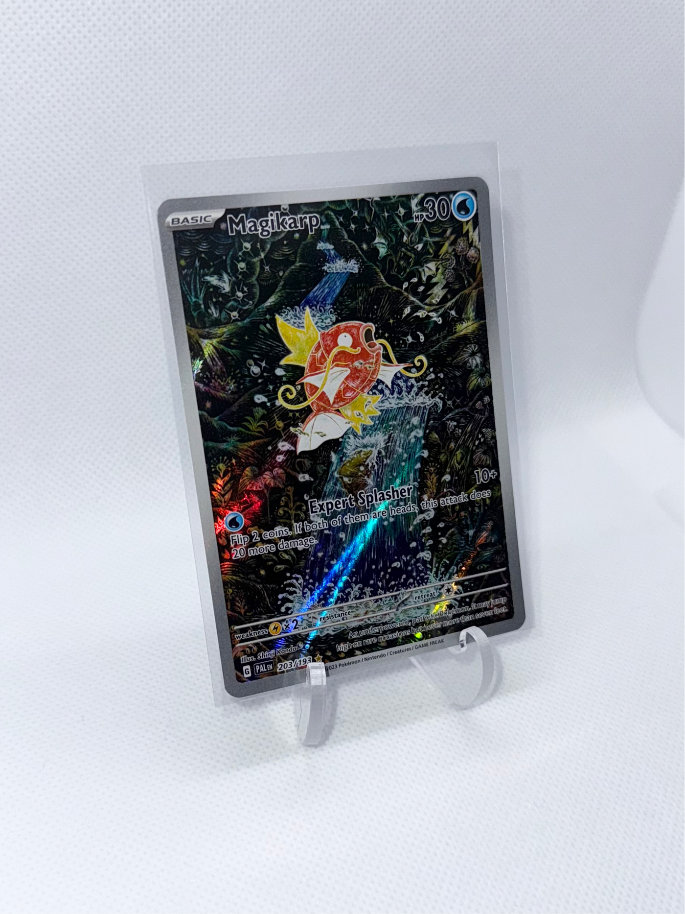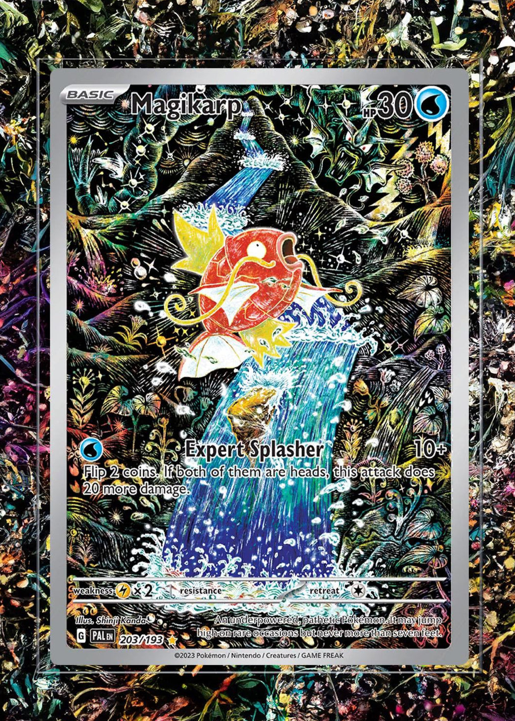 The Magikarp card, numbered 203/193, is an Illustration Rare from the Scarlet & Violet—Paldea Evolved expansion set. This card showcases a captivating artwork of Magikarp amidst a dynamic aquatic scene, highlighting its whimsical nature.