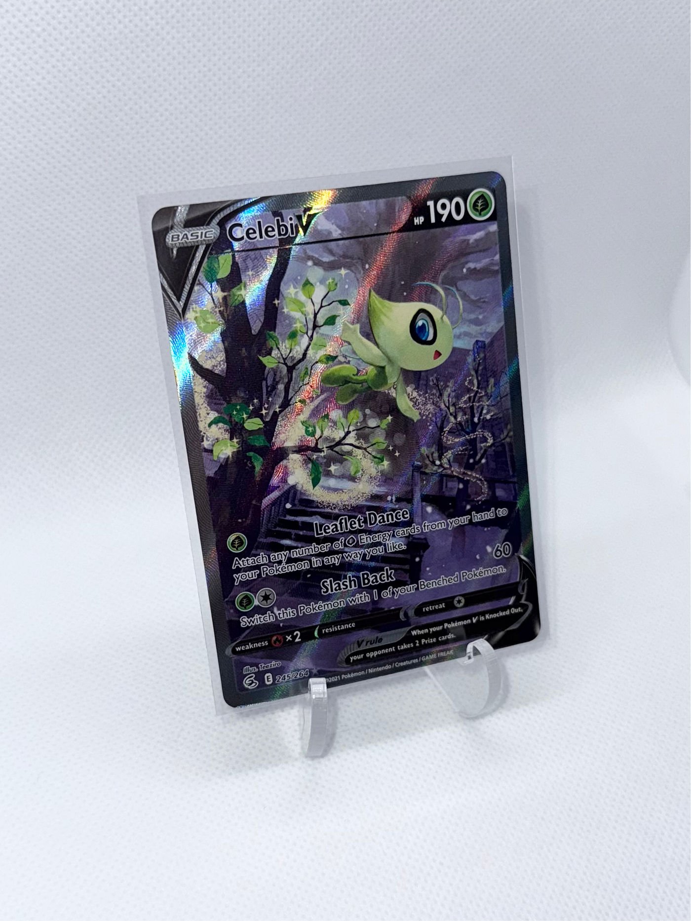 The Celebi V card from the Sword & Shield: Fusion Strike expansion is a notable addition for Pokémon TCG collectors. This Alternate Full Art Ultra Rare card, numbered 245/264, features the Mythical Pokémon Celebi in a vibrant and dynamic illustration.