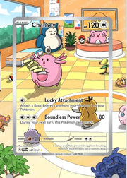 The Chansey card, numbered 187/167, is an Illustration Rare from the Pokémon Scarlet & Violet—Twilight Masquerade set. This card features Chansey in a nurturing scene, reflecting its role as a healer and caretaker.