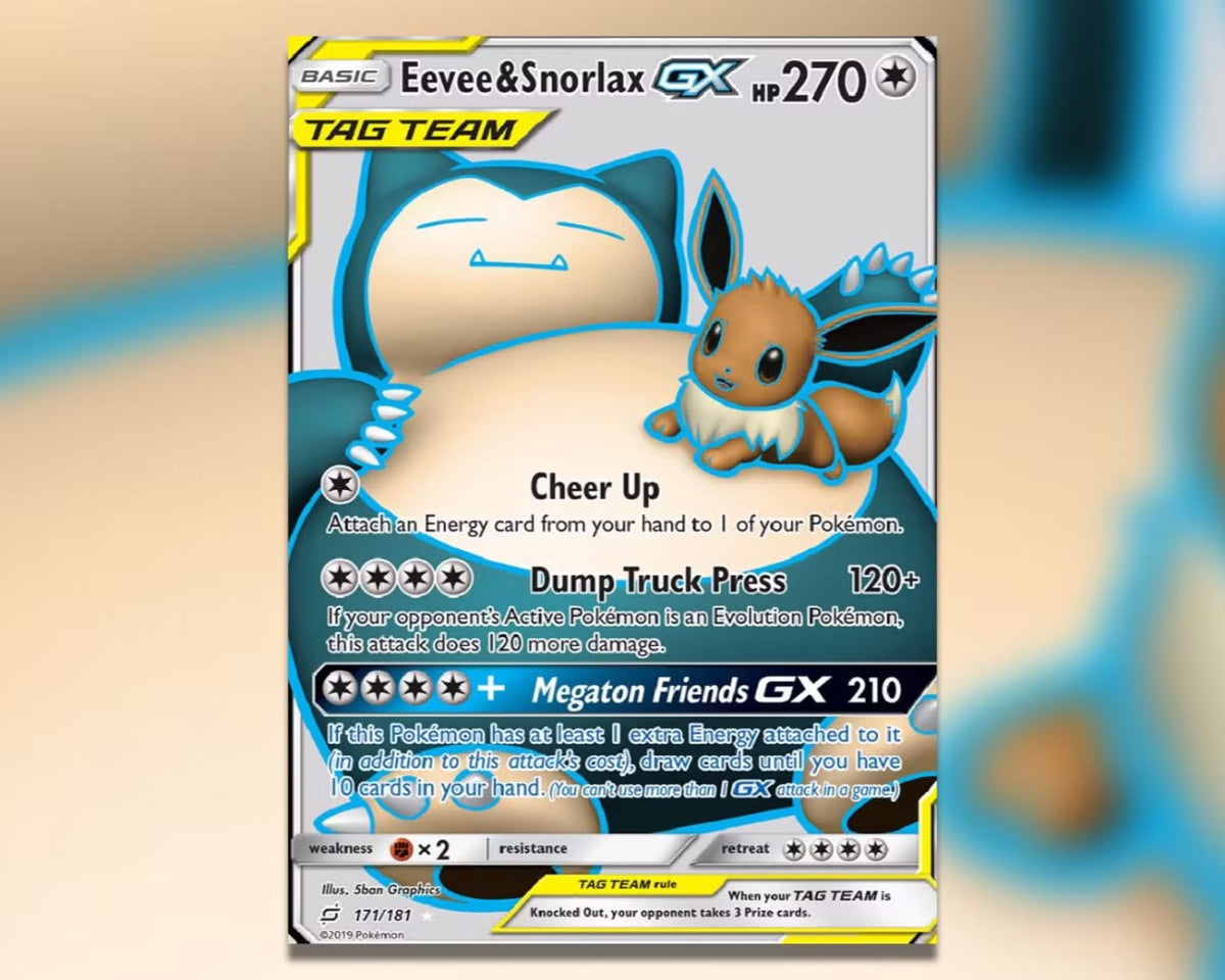 Introducing the Eevee & Snorlax-GX from the Sun & Moon: Team Up expansion! This Ultra Rare Full Art card, numbered 171/181, showcases the delightful duo of Eevee and Snorlax in a vibrant illustration, making it a standout piece for collectors and players alike.