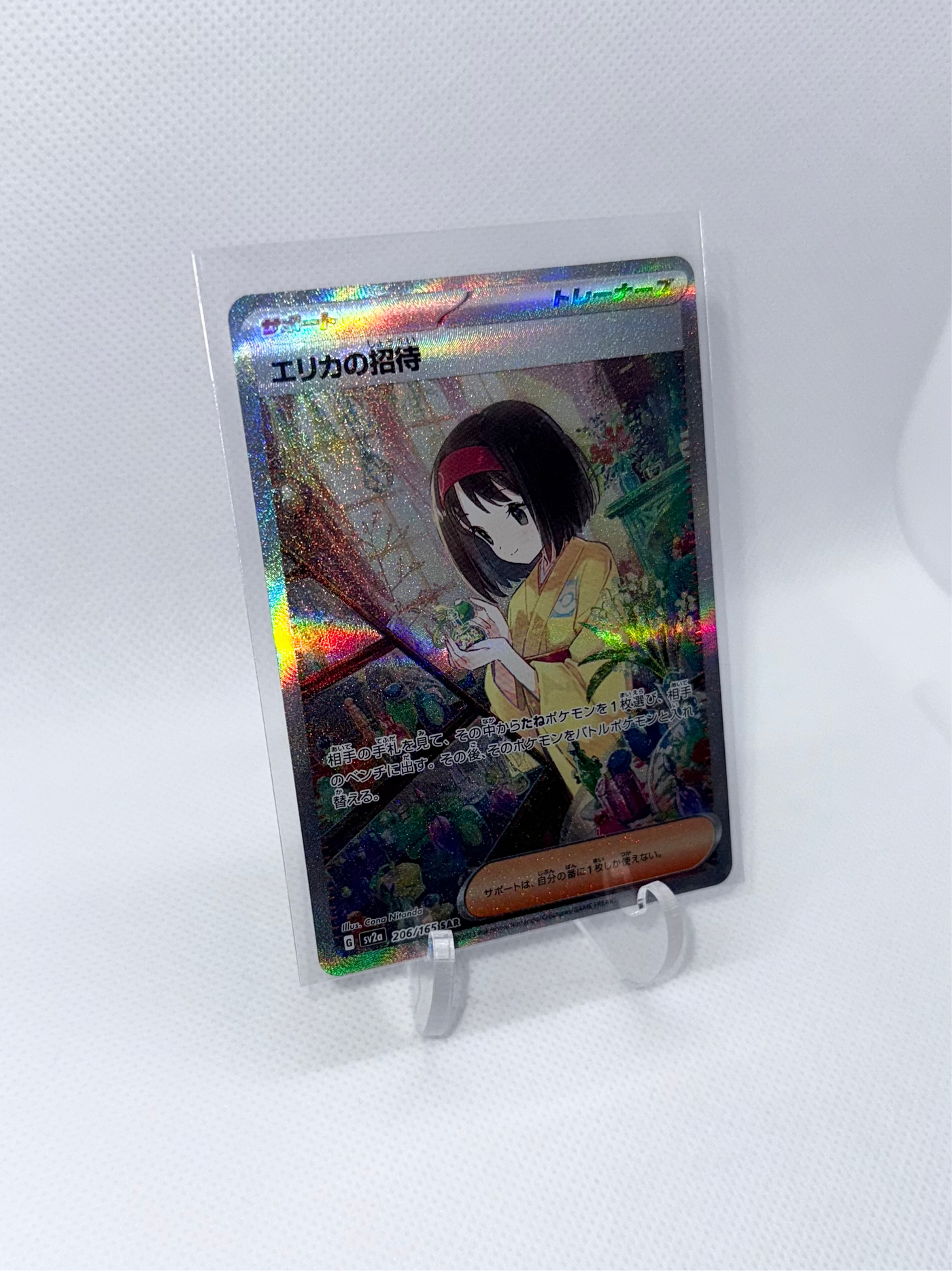 Introducing the Erika's Invitation card from the Japanese Scarlet & Violet 151 expansion! This Special Art Rare (SAR) card, numbered 206/165, features exquisite artwork that captures the elegance of Gym Leader Erika, making it a coveted piece for collectors and enthusiasts.