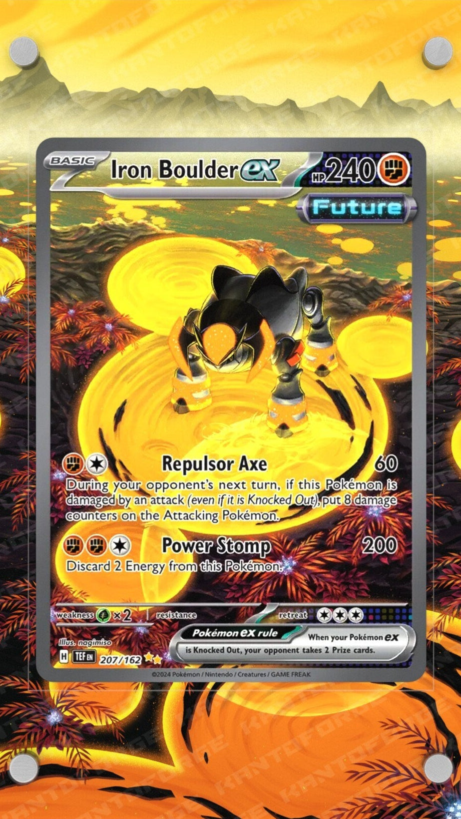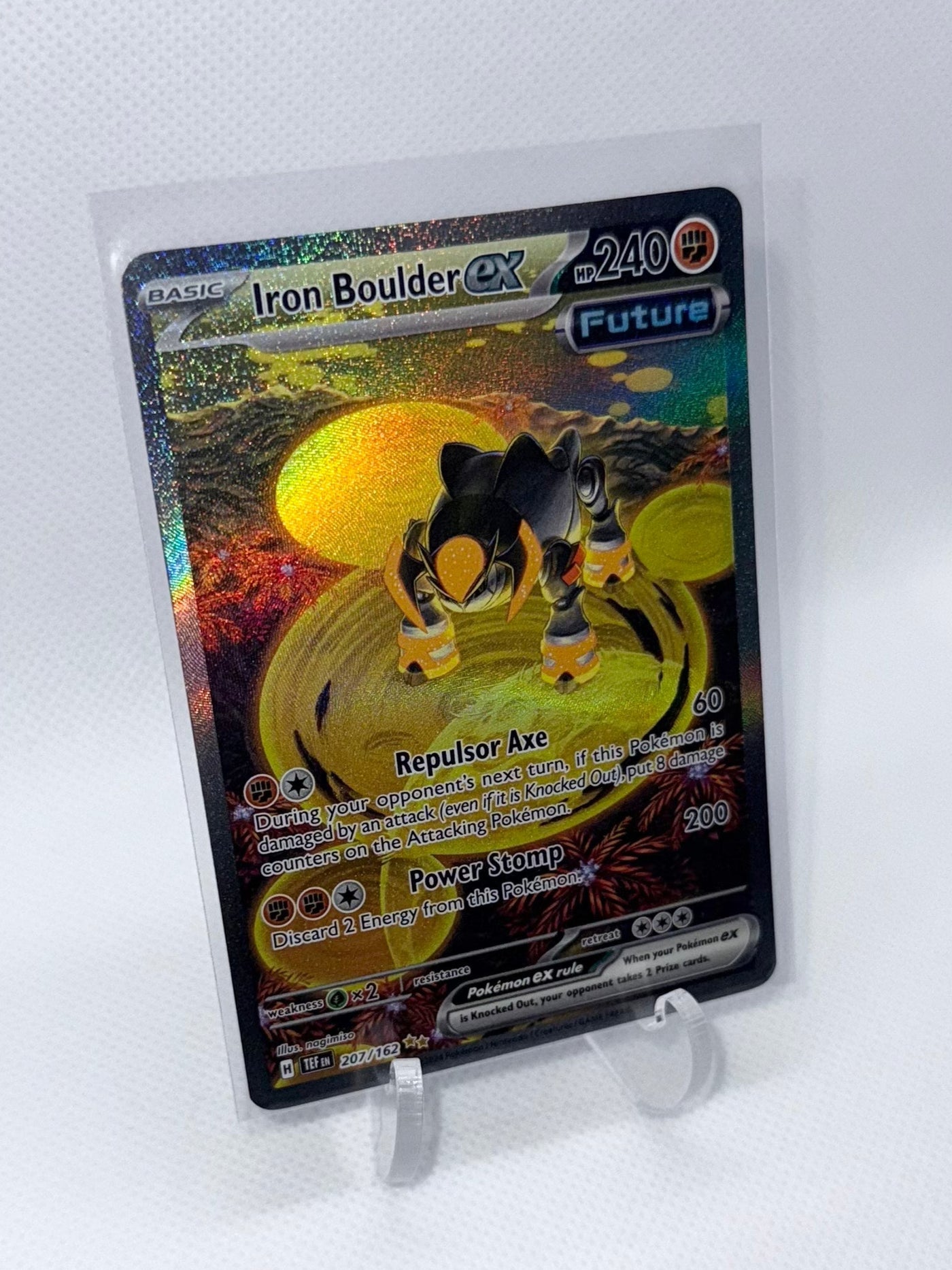 Introducing the Iron Boulder ex Special Illustration Rare from the Scarlet & Violet: Temporal Forces expansion! This card showcases stunning artwork, capturing Iron Boulder in a dynamic pose. With a formidable 240 HP and powerful attacks, it's a prized addition for both collectors and competitive players.