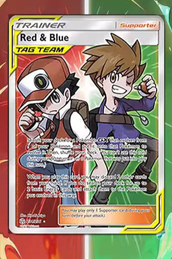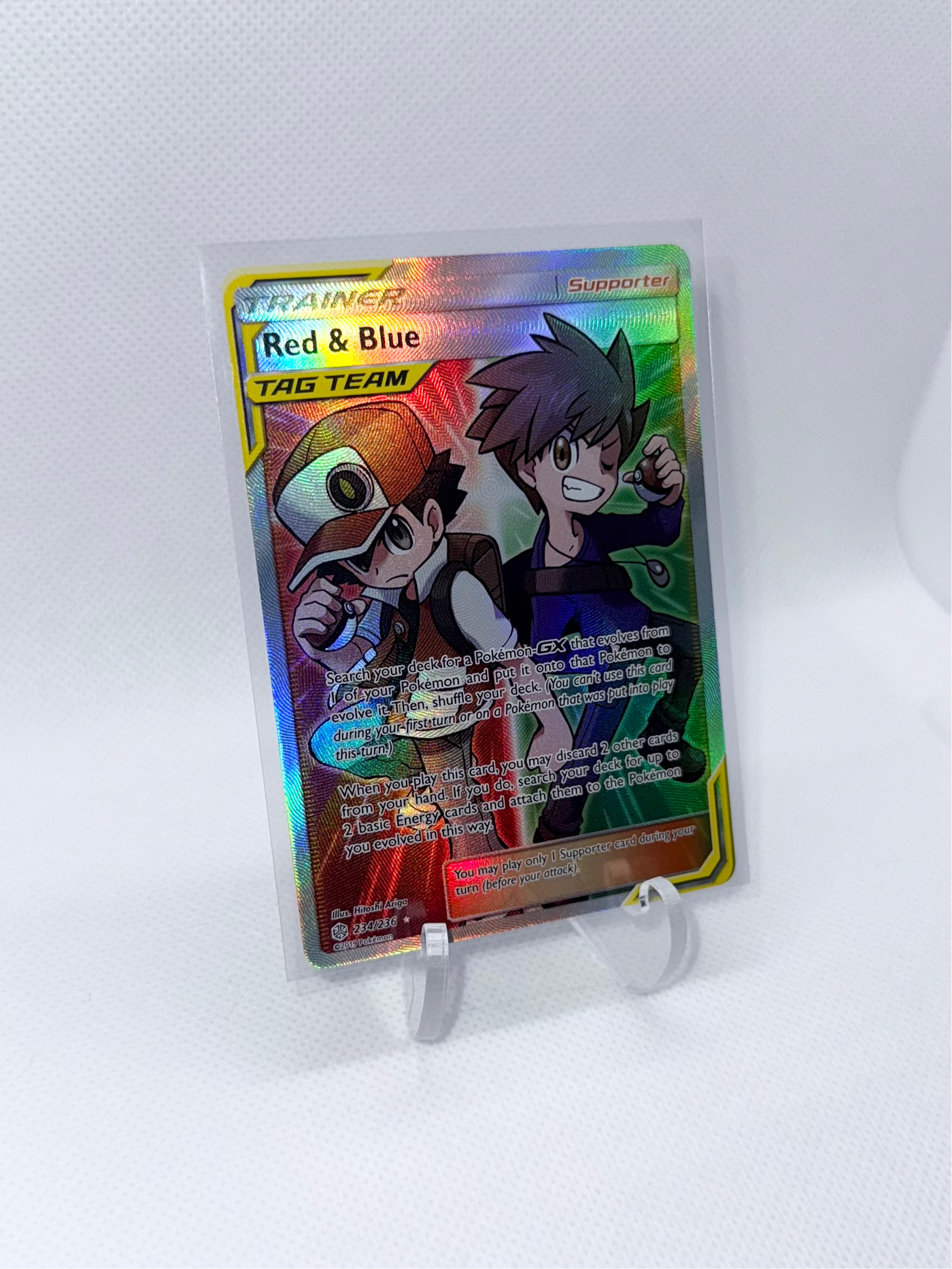 Introducing the Red & Blue Full Art Trainer card from the Sun & Moon: Cosmic Eclipse expansion! This Ultra Rare card, numbered 234/236, features iconic artwork of the original Pokémon Trainers, Red and Blue, making it a coveted addition for collectors and players alike.